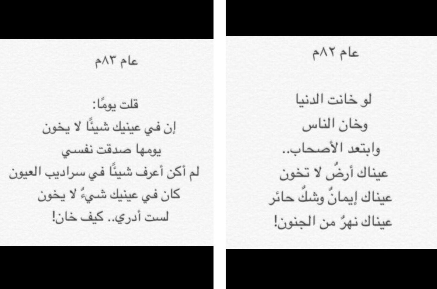 Ma على تويتر كتب فاروق جويدة عام ١٩٨٢م عيناك أرض لا تخون وبعدها بعام كتب كان في عينيك شيء لا يخون لست أدري كيف خان