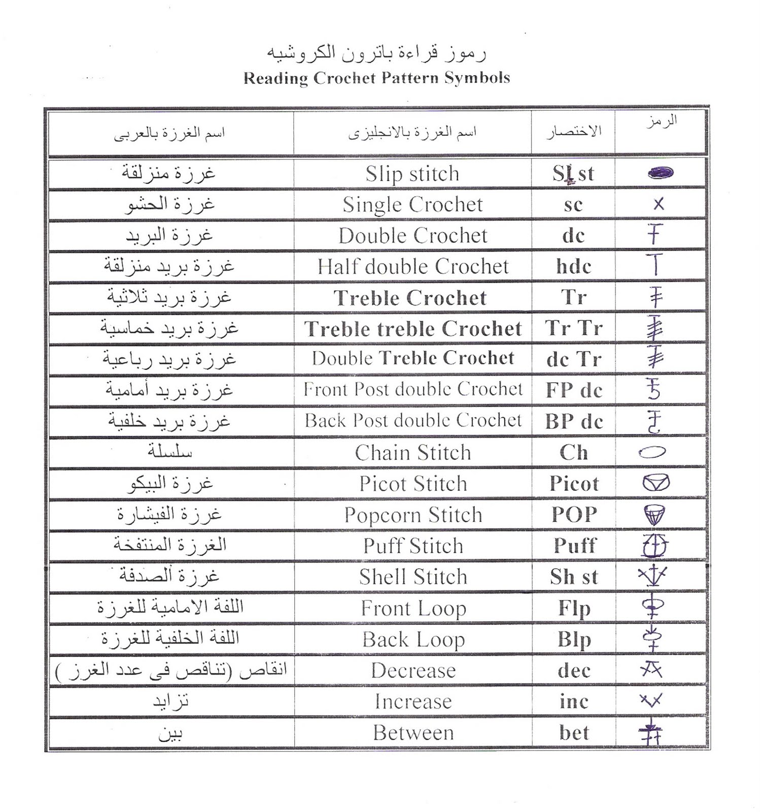 غرز الكروشيه بالانجليزي