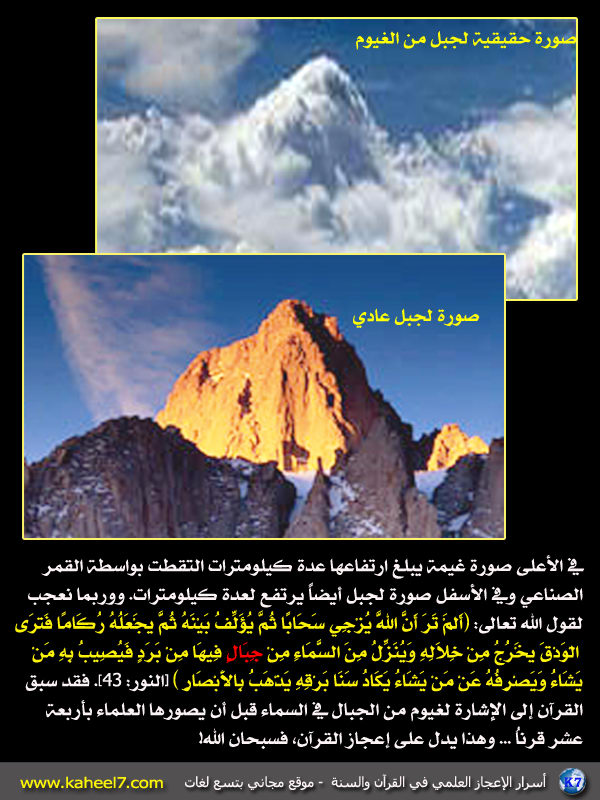 قال الله أ ل م ت ر أ ن الله ي ز ج ي س ح ا ب ا ث م ي ؤ ل ف ب ي ن ه ث م ي ج ع ل ه ر ك ا م ا ف ت ر ى ال و د ق ي خ ر ج م ن خ لا ل ه و ي ن ز ل م ن الس م ا ء م ن ج ب ا ل ف ي ه ا م ن ب ر د ف ي ص ي ب ب ه م ن ي ش ا ء